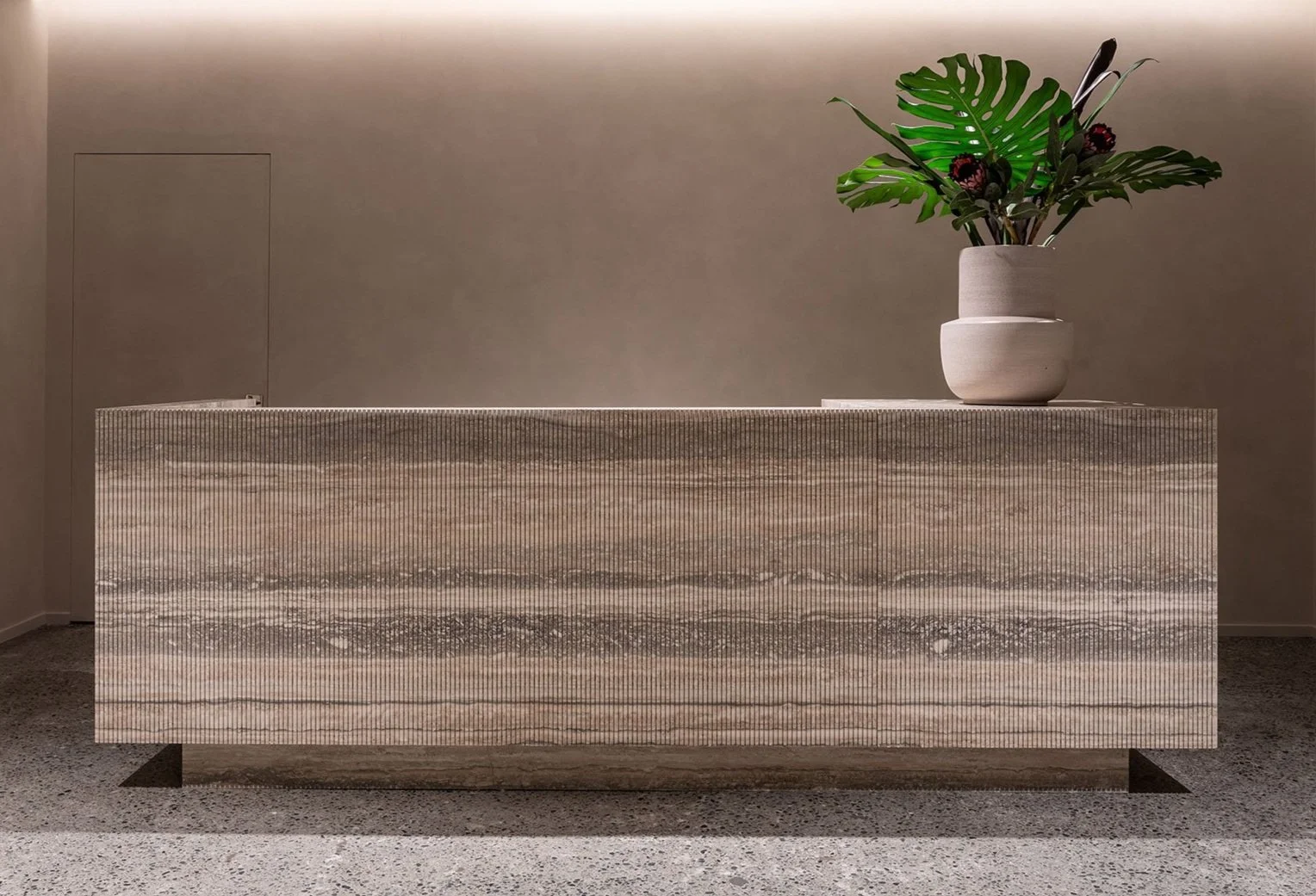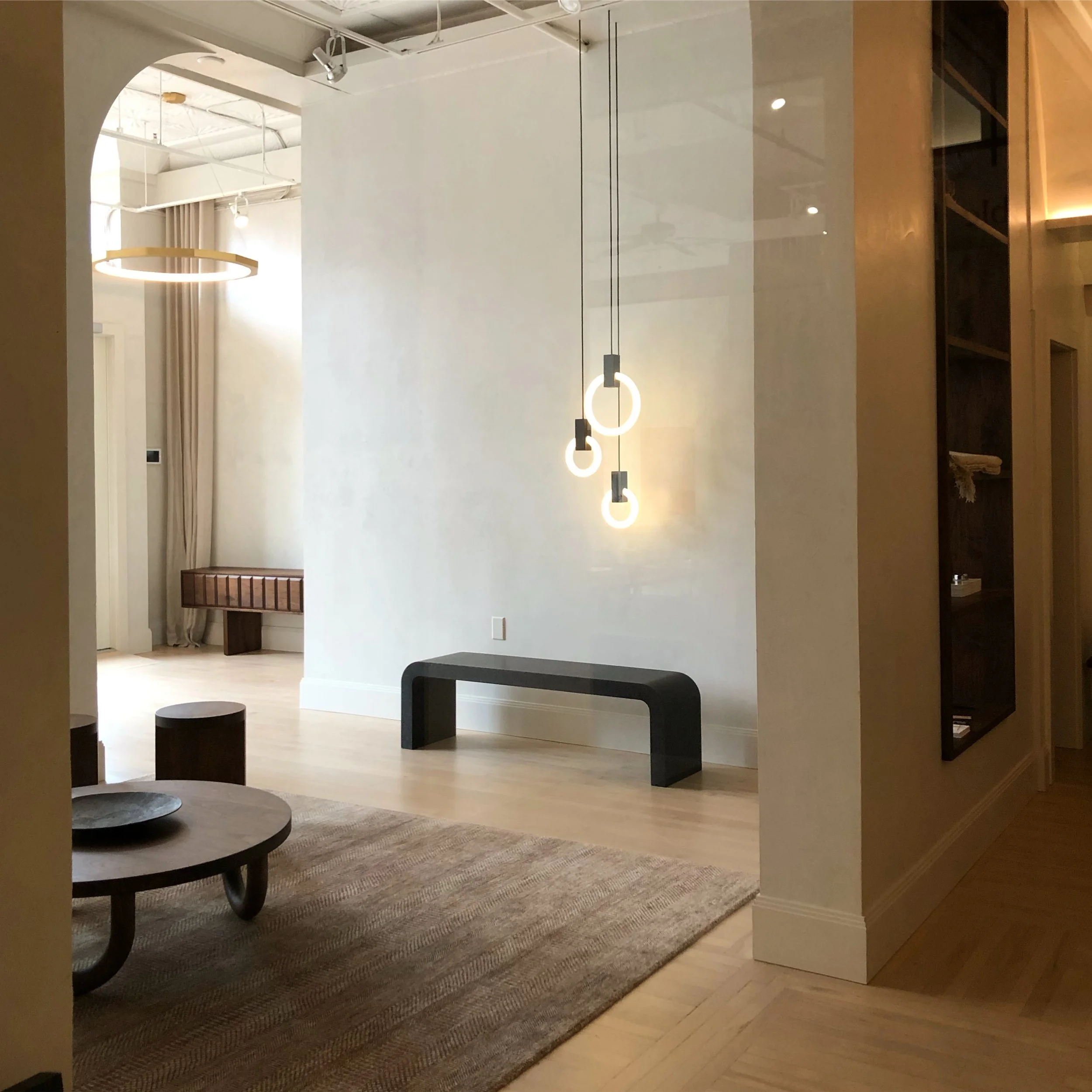 Myra bench in Cambrian Black granite. Lock & Mortice Arcade Showroom Vancouver.